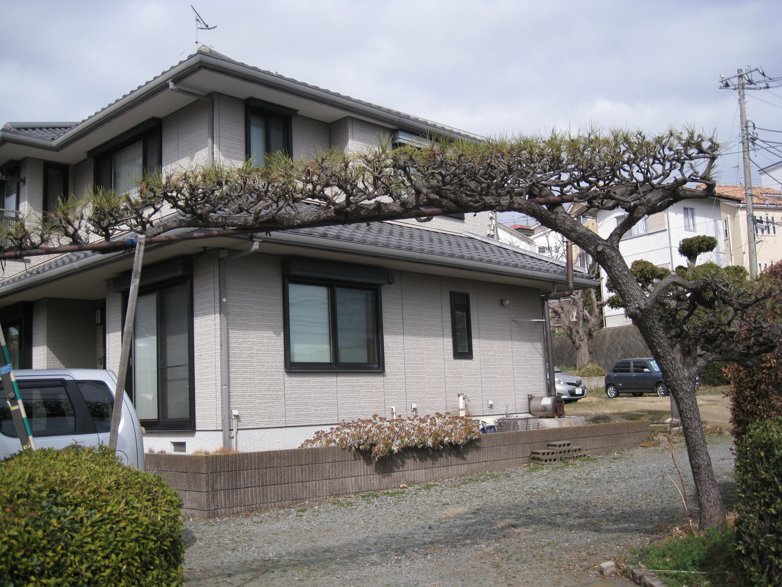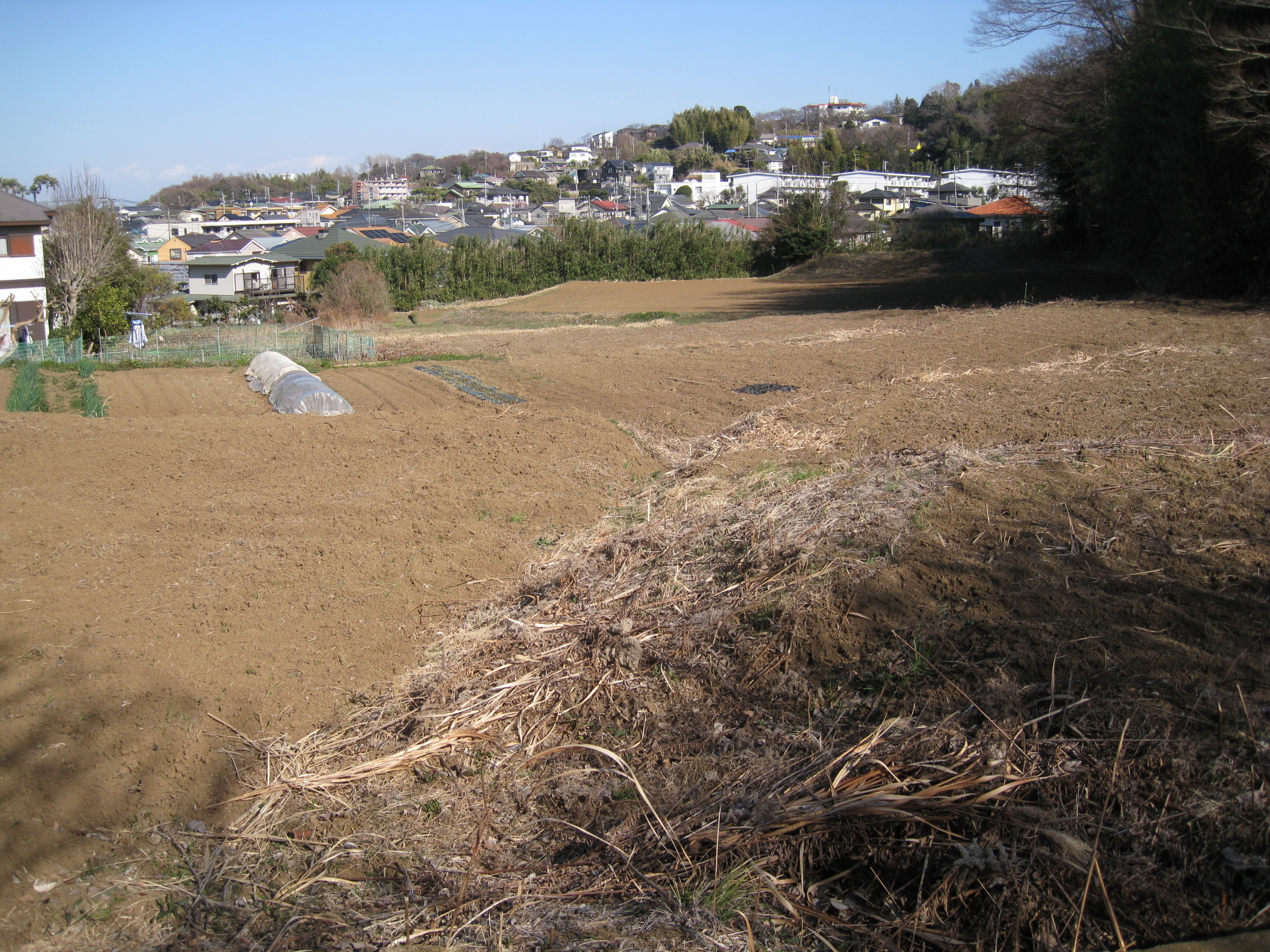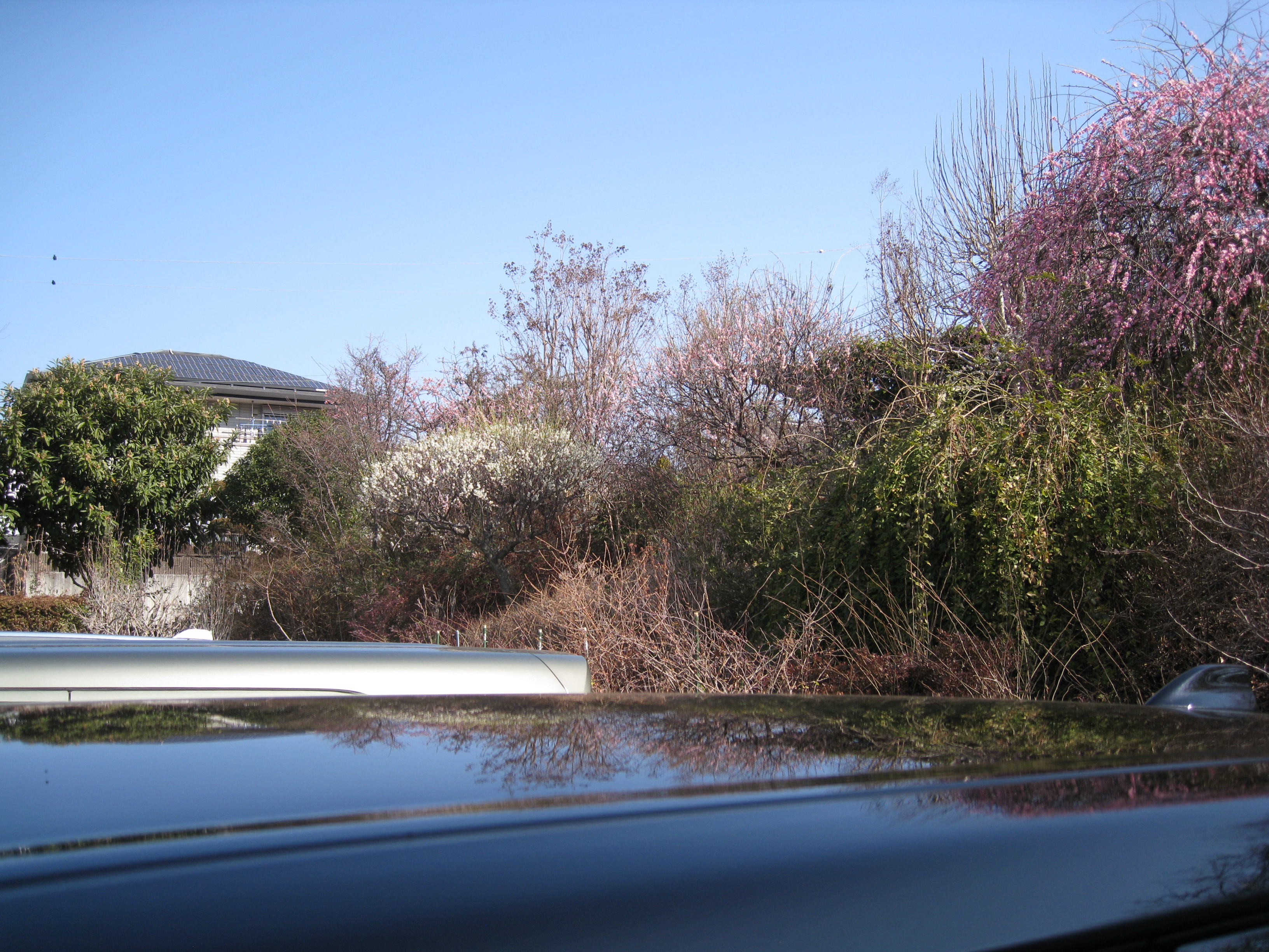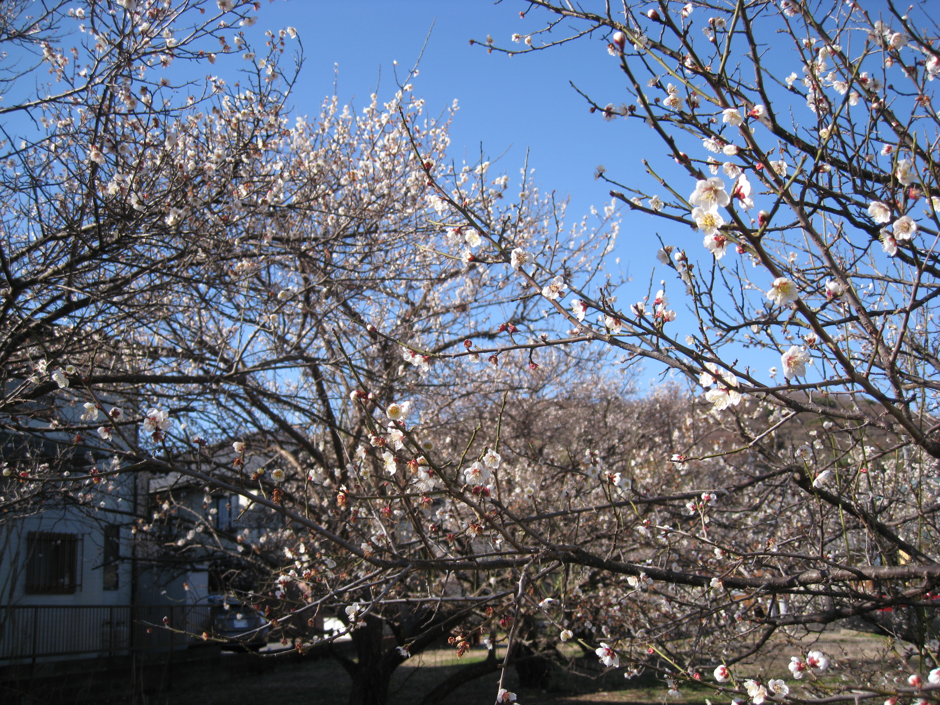 天国“の駐車場の奥(東?)は土手になっていて、今は花桃、紅梅、白梅、臘梅などが咲き競っています。土手の上には、民家、テニスクラブ、畑、林等々が幾層にもなって存在しますが、結局行きつくのは丹沢ではないでしょうか。我々はその裾野の果てにいるような気がします。まあ、地理音痴の私の勘はあてになりませんが。 |