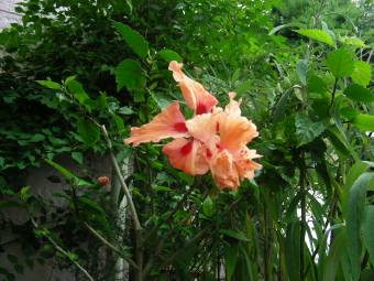 ハイビスカスは1日花ですが、日当たりのよい庭におけば次々につぼみをつけて咲ます。 |