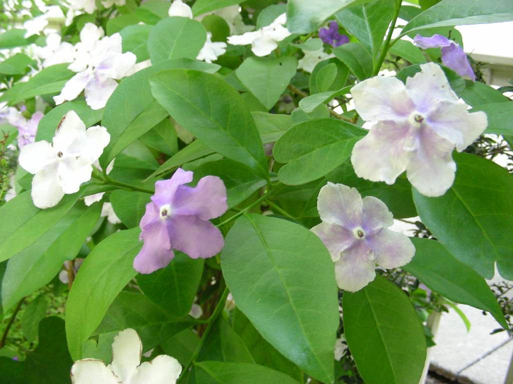 英名Yesterday-Today-Tomorrowは,花は咲いたときは紫で,日にちが経つに連れ白くなることからつけられた。「蕃」は外国,「茉莉」はジャスミンのことですが,ジャスミンの仲間ではなく,ナス科の植物です。 |