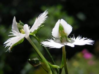 サギソウの花の「白鷺」に似た部分は唇弁(しんべん)と呼ばれる花弁で、大きく3裂し、 両側がフリル状に裂けている。ラン科の花は発達した唇弁が特徴でサギソウの唇弁も もともと上部にあった花弁の1枚が変化したものといわれる。 進化の過程で受粉を助けるガやハチなどがとまりやすいように下部につき 大きくなったのだという。 |