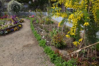 1月のガーデンとほぼ同じ花ですがいろいろな花の芽がふくらんできてます。シダレウメが8分咲きとなりました。 |