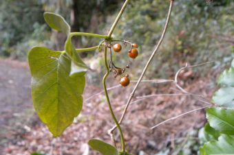ヒヨドリジョウゴ 赤く熟した果実に野鳥のヒヨドリが好んで食べることから付いた名前です。