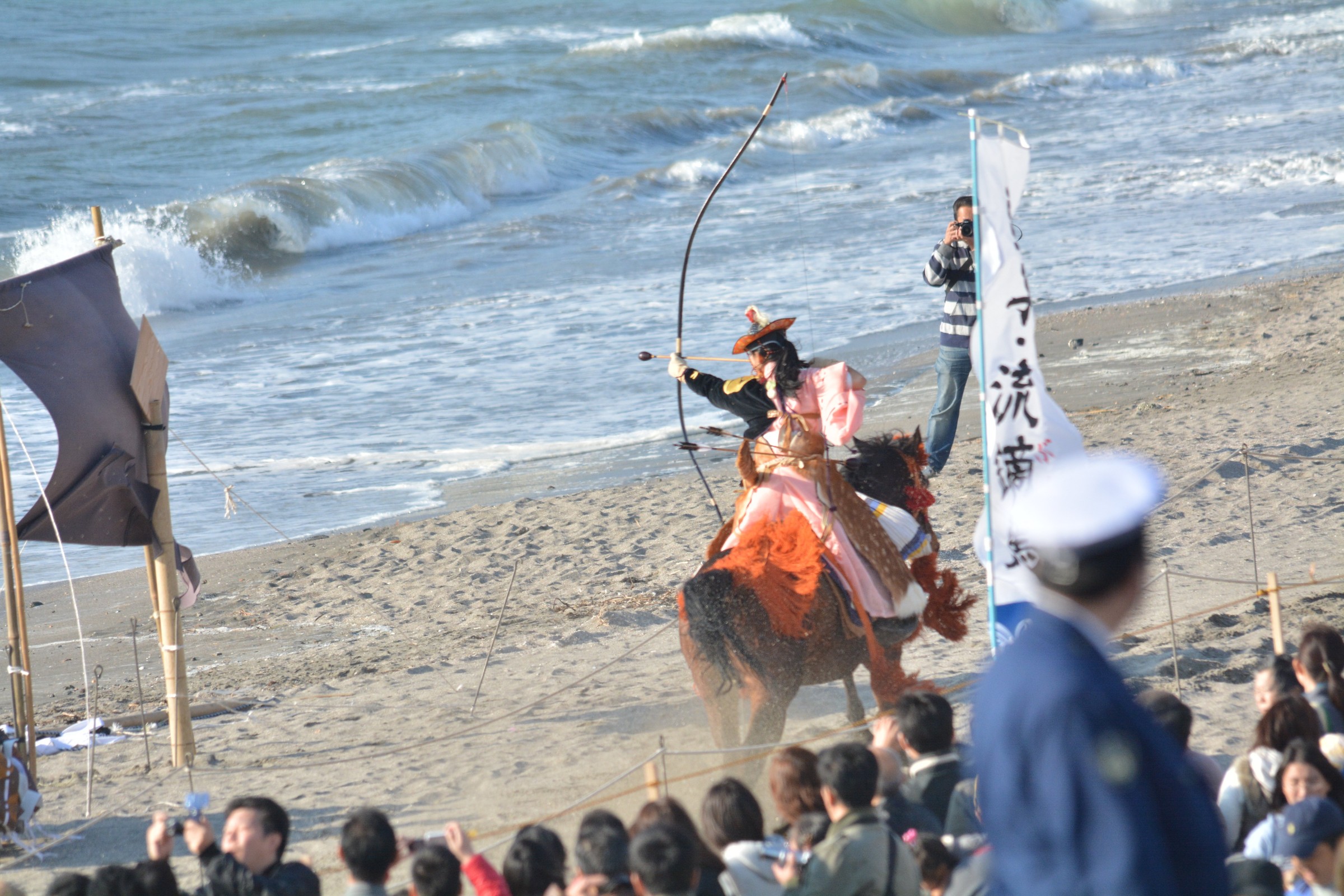 流鏑馬と武者行列//海岸での流鏑馬は珍しい。 流鏑馬は、鎌倉時代に天下泰平を祈願するために催されたといわれています。 逗子の流鏑馬も歴史のあるもので、 戦後、往時をしのんで復活しました。 当日は、武者行列がまちを練り歩き、海岸では武田流による騎射が披露されます。 // [地図]