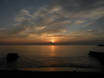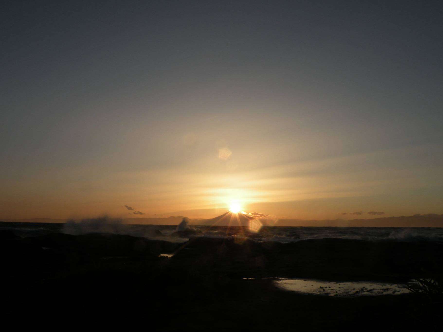 朝、7時頃に富士山がかすかに見えた。天気は快晴。沈む予定の時刻では小田原、御殿場ともに快晴。
