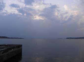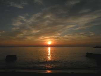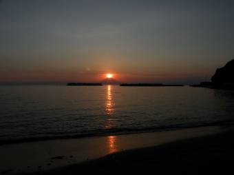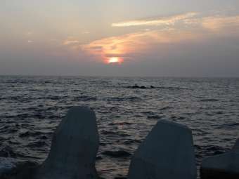 16時55分に家を出る。途中で海を見ると太陽がまぶしかった。 |