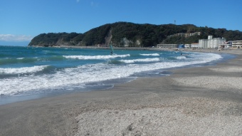 江ノ島がくっきりと見えてその上の方に富士山がそびえ立ってる。 浜辺約1Kmの逗子海水浴場は、遠浅で波静かなファミリービーチ。披露山のふもとに建つお堂は、徳富蘆花の小説「不如帰」のヒロイン片岡浪子の名をそのままに浪子不動と呼ばれる。そこから海を見下ろすと、海面に建つ不如帰の碑が見える。 |