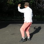 3 体を左方向にす少し移動する 重心を右足に移し上体を右に回すのに合わせて右腕を下方に弧を描く。 体は右方に回し、(掌心は下方)弧を 描いて右脇腹のそばに引き寄せる。右手が下方に来たときはぶらぶら力を向く。 右掌は内側 |