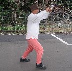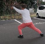 左弓足/右拳は前下方に打ち出して腹部と同じ高さ。拳眼は左。上体は前かがみ。 左掌は左大腿部の横に移して押さえるようにおく。掌心は下で指先は前/ 目は右拳 |