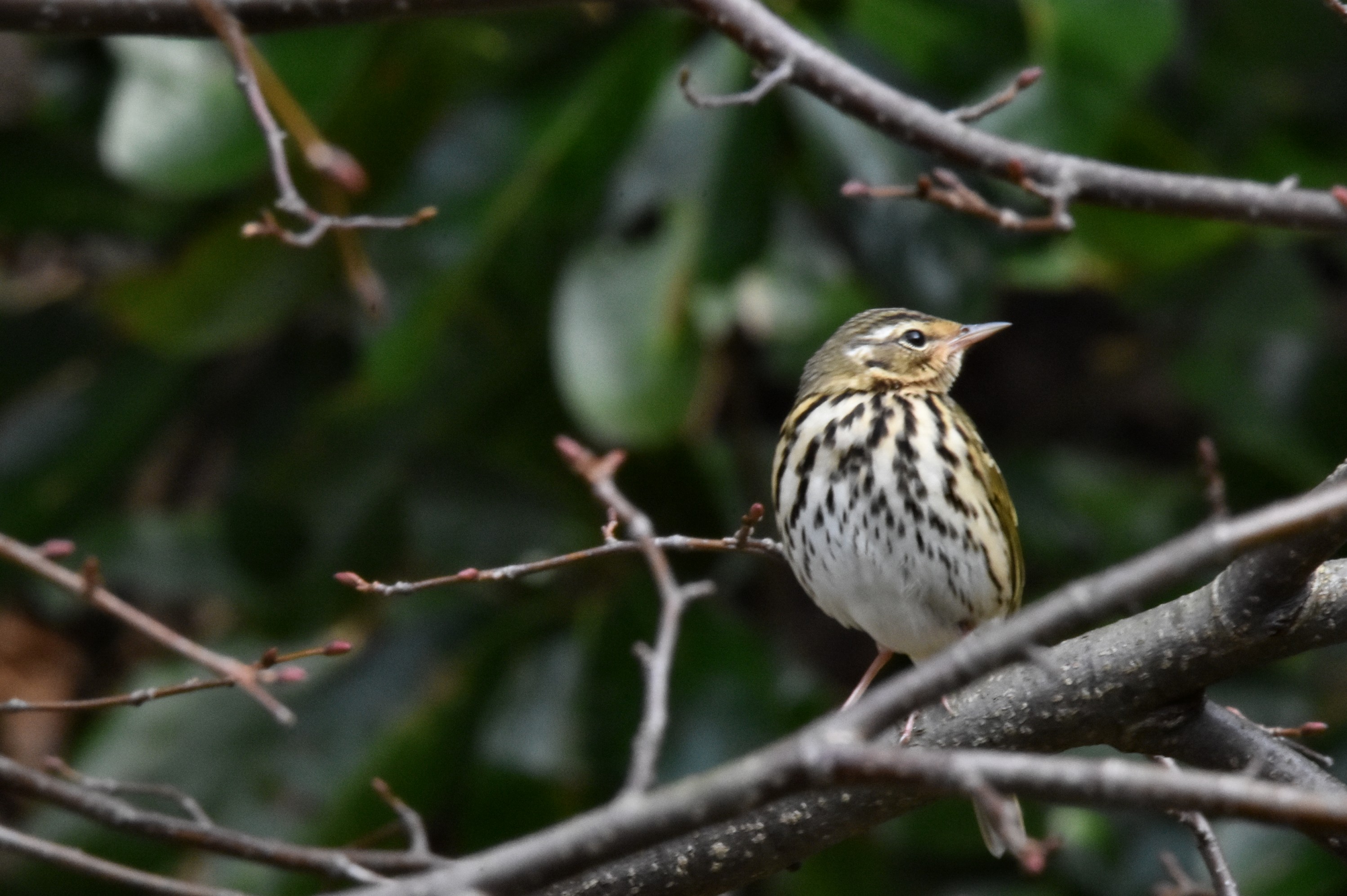 オリーブ緑色の上面。目の後方の白班。黒色の顎線とそれに続く胸からの縦班