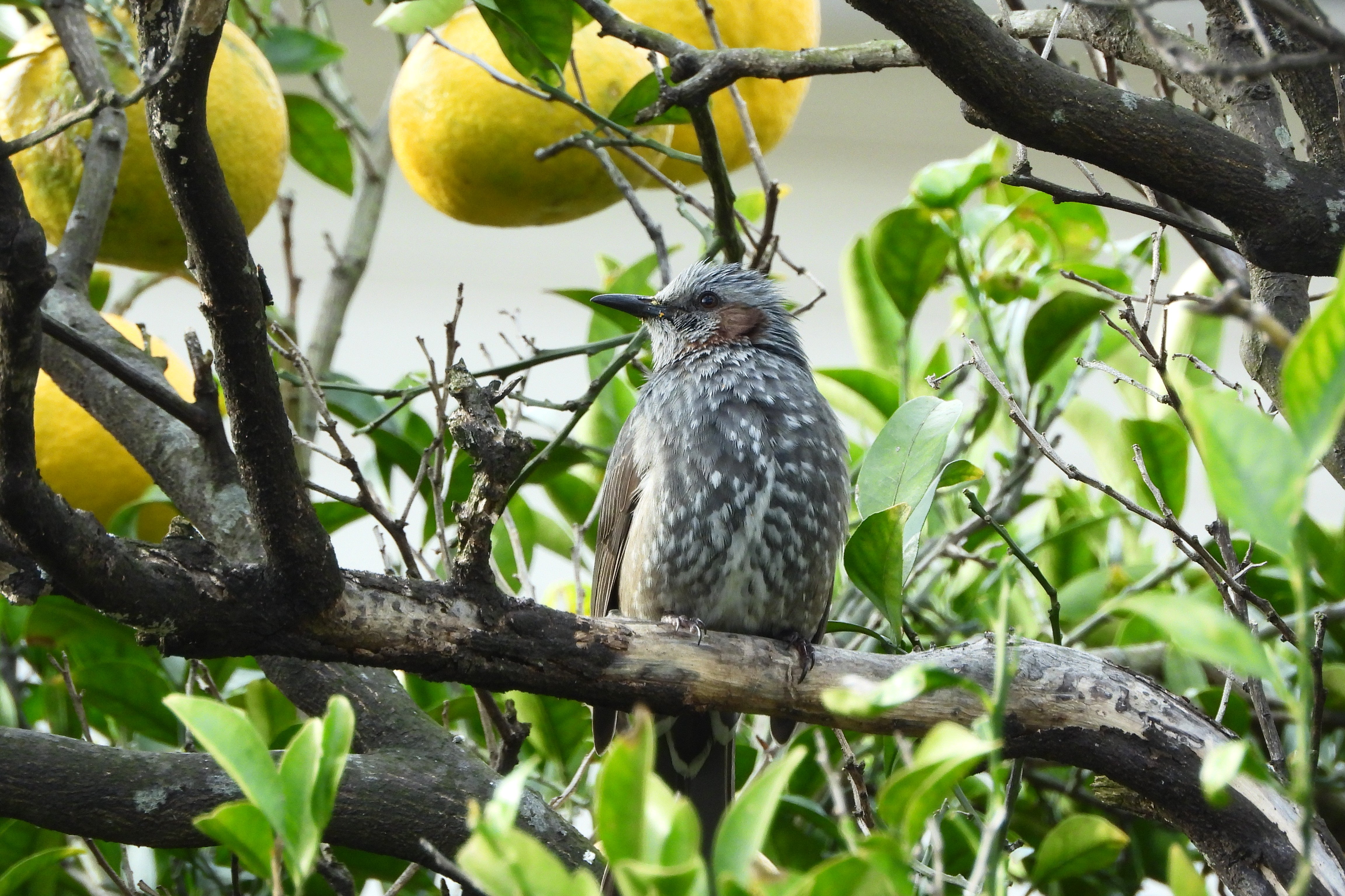 全長28cm。ほほの部分に茶色い部分がある。青褐色から灰褐色の体。褐色の耳羽。ピーヨまたはヒーヨと聞こえる。/