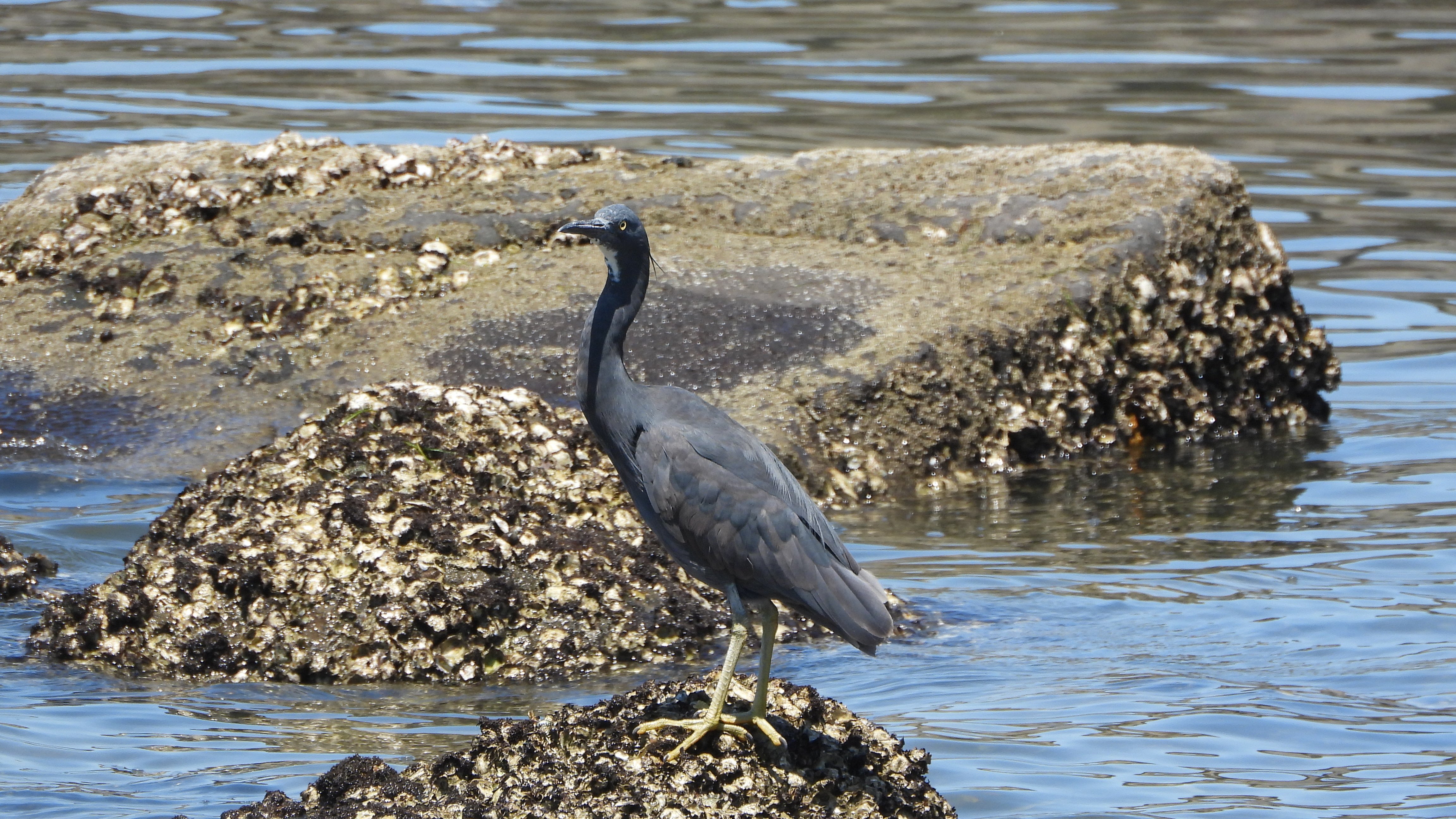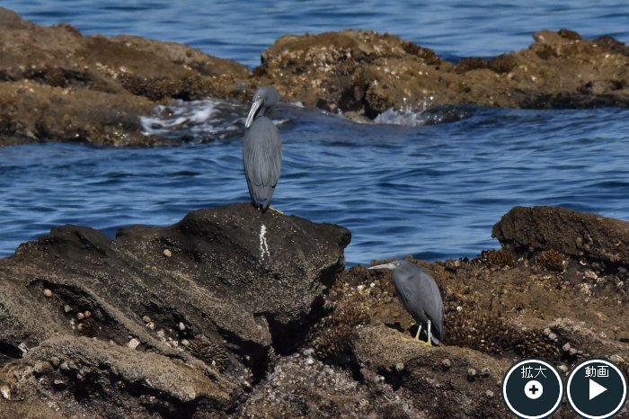 クロサギ1羽とチュウシャクサギ1羽が岩場を歩き餌を探していました。 |
