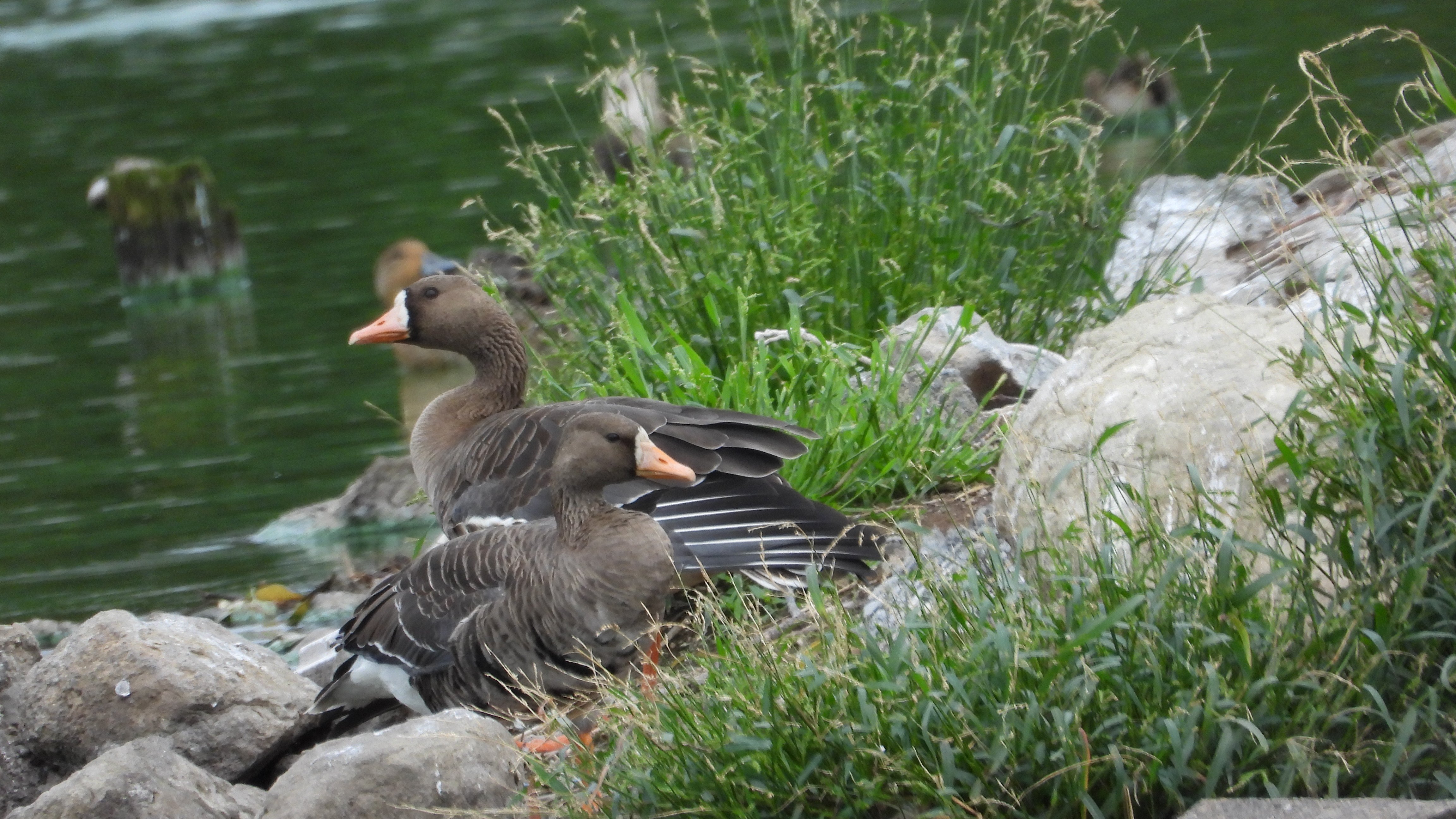 | 一昨日見たマガンをもう少し撮りたくてくつわ堰に行ってきました。 着いたら池の中にある築島の周りに二羽のマガンが座って羽繕いをしていました。 それから水に入ってパタパタ水遊びです。 |